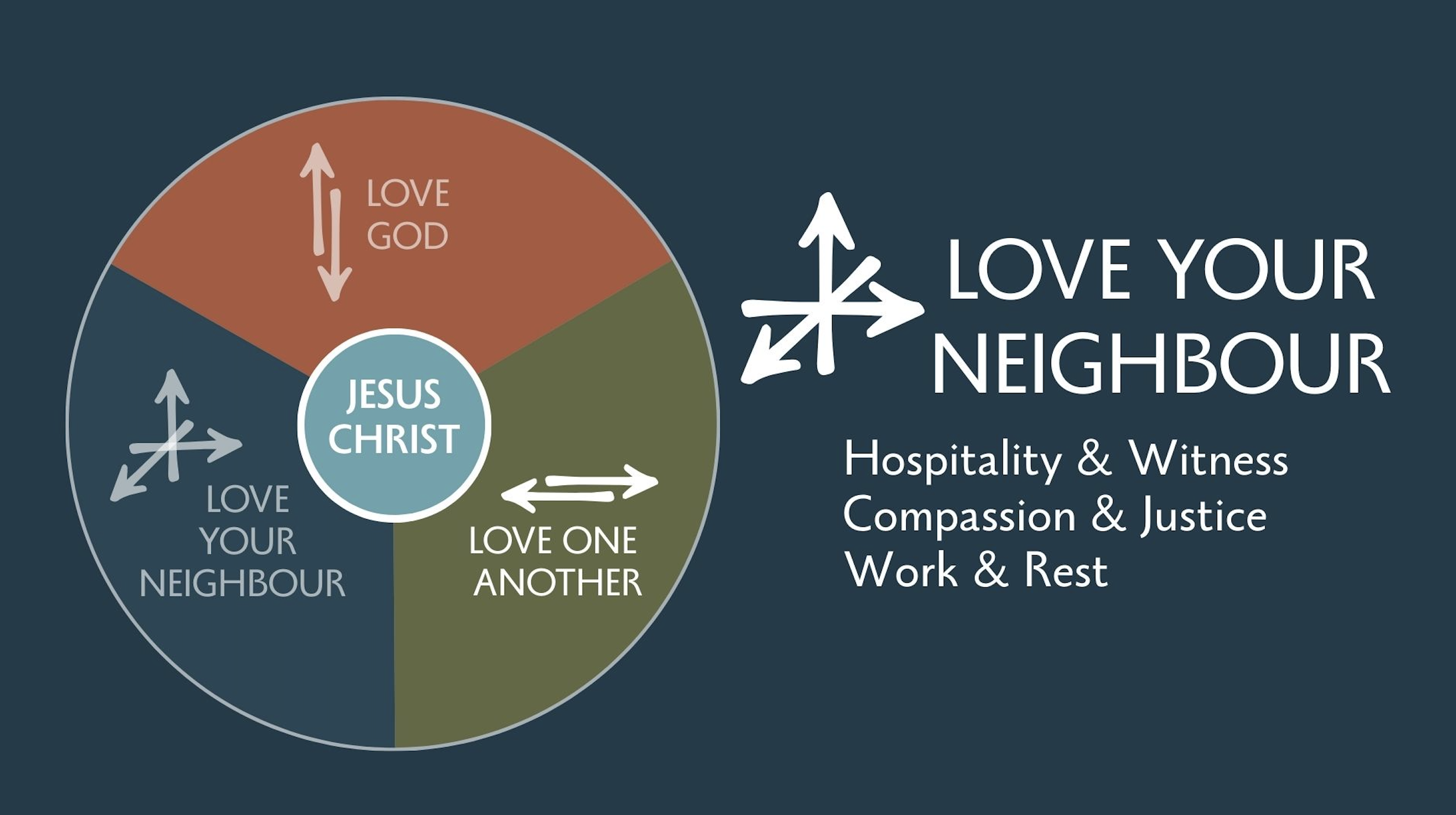 Our Discipleship Wheel is a simple, visual framework that helps us keep Jesus Christ and his gospel at the center of everything we do. Rather than reducing spiritual growth to a single activity, it reminds us that following Jesus is holistic and relational. We grow as we love God, love one another, and love our neighbour - expressed through practices such as worship and prayer, life in a committed Christian community, hospitality and compassion, generosity, and faithful presence in our everyday work and rest. These are not rigid categories or a complete list, but examples of the rhythms that shape us over time. The wheel serves as a gentle guide, helping us discern where God may be inviting us to grow and encouraging us toward a steady, grace-filled life that reflects the heart of Christ.